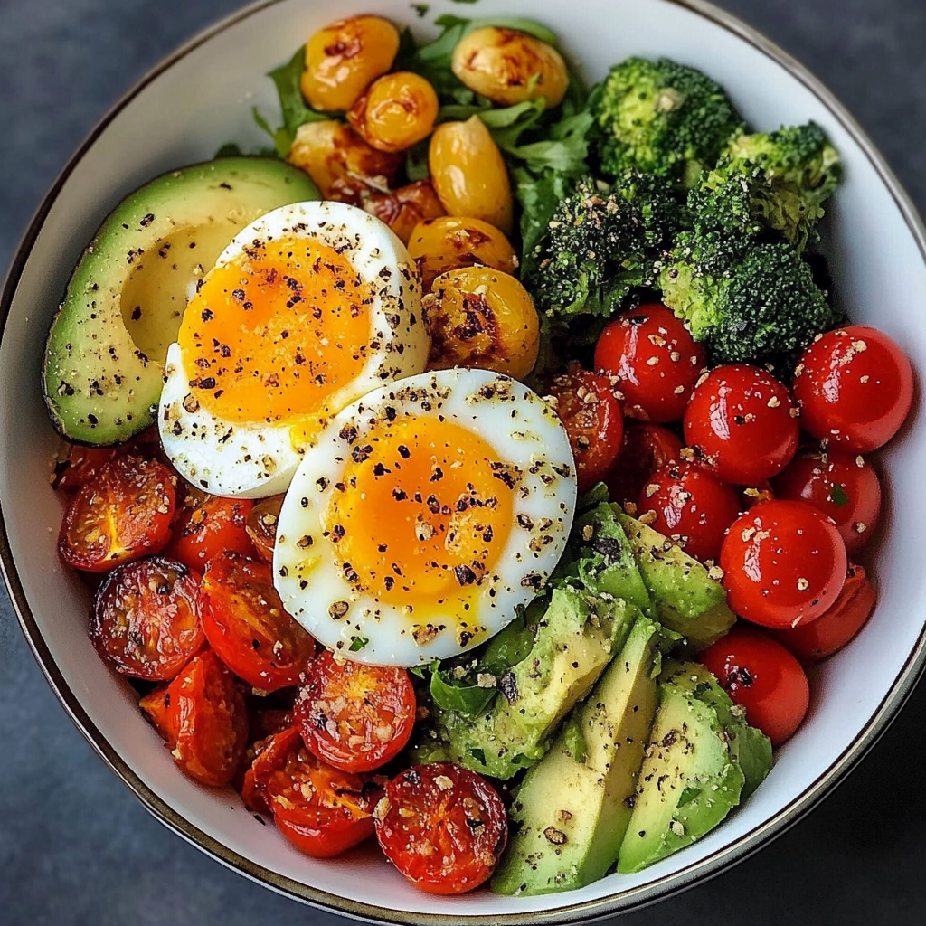 - Assemble the Bowl: On a serving plate, arrange avocado slices alongside halved boiled eggs. Top with roasted veggies and sprinkle with optional spices or sesame seeds.