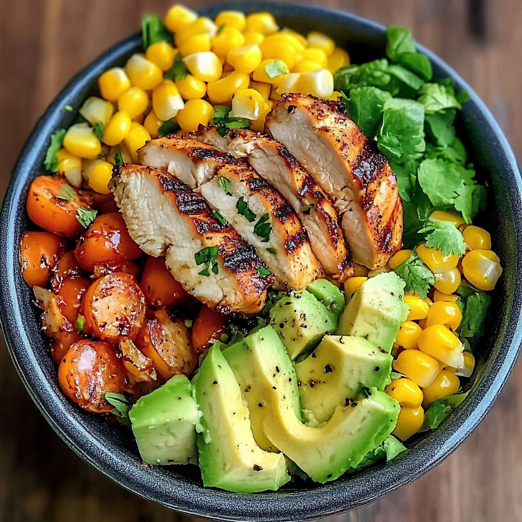 Enjoy this colorful Grilled Chicken Power Bowl with Avocado & Corn as a nutritious meal that’s both filling and flavorful!
